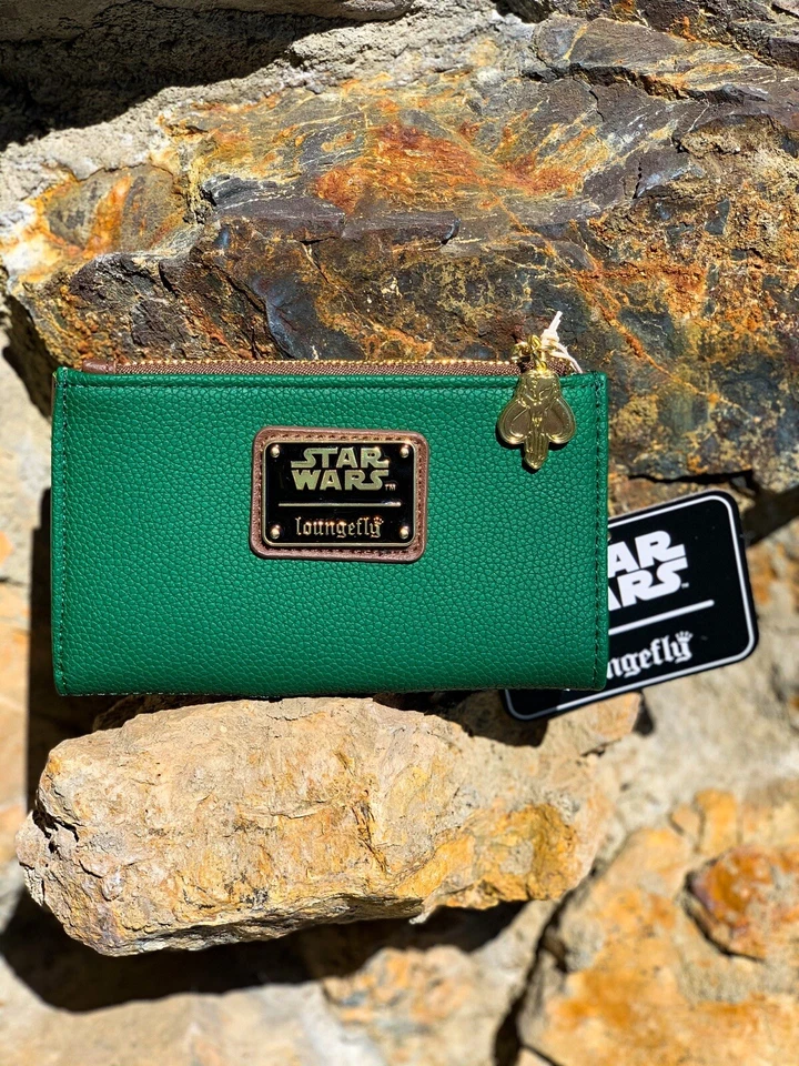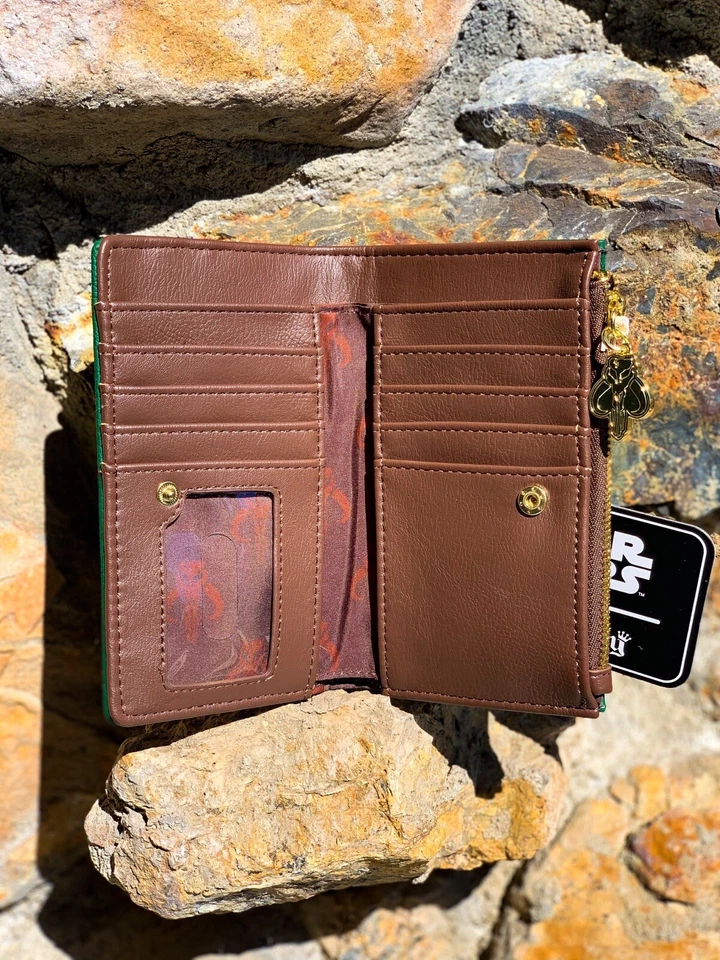 - Wallet Details: Compact bi-fold or zip-around style, approx. 6" W x 4" H, with multiple card slots, a clear ID window, zipper coin pocket, and a Mandalorian charm for secure, stylish storage.